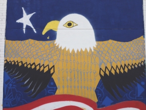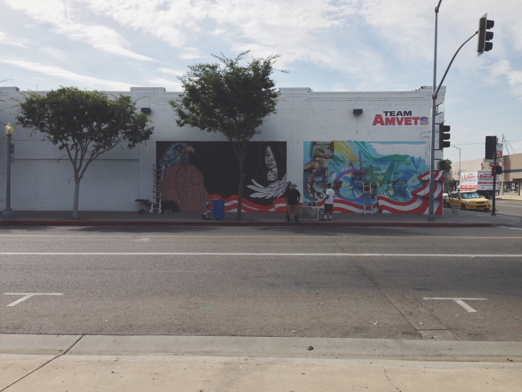 I asked Erik what has been the public response to this mural. He says pedestrians, car drivers, and shoppers tell them they are doing a great job. Some even take photos. A lot of Team Amvet’s shoppers are veterans. Some have stopped to admire the mural in progress and share their stories about their service.