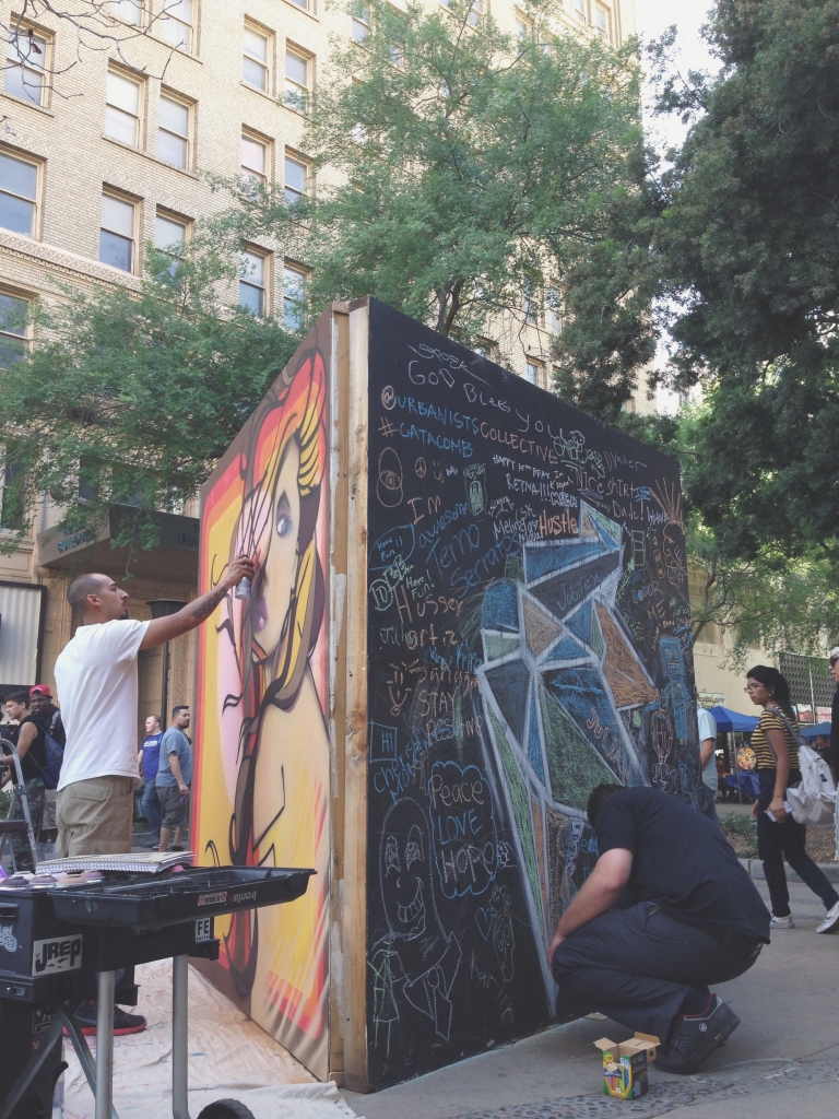 The organization started soon after Erik curated the urban art exhibit at the 2011 Taste of Arts Festival in Visalia (watch video). It was there he discovered a strong audience for urban-influenced art. Erik reached out to other artists around California who were serving their community in their own way. “We had all of these ideas but no money. We used our leftover supplies from past projects,” says Erik, describing the beginning of the organization.